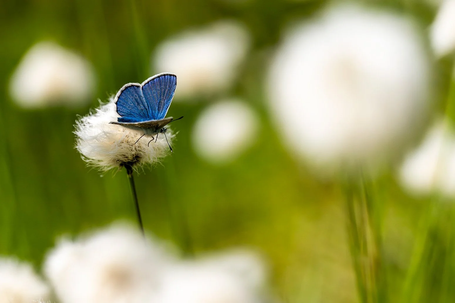 Die beiden merkten anscheinend recht schnell, dass ich keine Gefahr darstellte und so ging das eine ganze Weile. Sogar wenn ich mich bewegte, wichen sie nur selten für kleine Entspannungspausen auf das umliegende Wollgras aus. Dies war dann jedes Mal meine Chance! Der Wind, die Größe der Schmetterlinge und das schwankende Wollgras vereitelten zwar einige Versuche, doch es gelang und das ganz oben gezeigte Bild des Monats entstand.