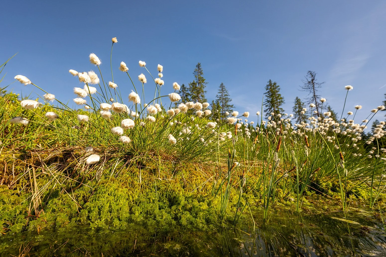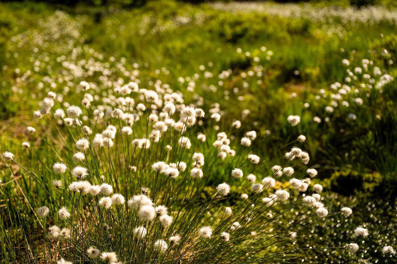 Doch das sind alles eigentlich sehr angenehme Herausforderungen. Beim Besuch der Flächen packt mich jedes Mal erneut die Faszination für diesen ganz besonderen Lebensraum. Gerade jetzt, wenn das saftige Grün leuchtet und das Wollgras mit seinen weißen Samenständen so schöne Kontraste setzt, könnte ich stundenlang einfach zuschauen, wie sich die weißen Puschel im sanften Wind wiegen und Libellen, Falter, Fliegen und anderes Getier dazwischen herum saust.