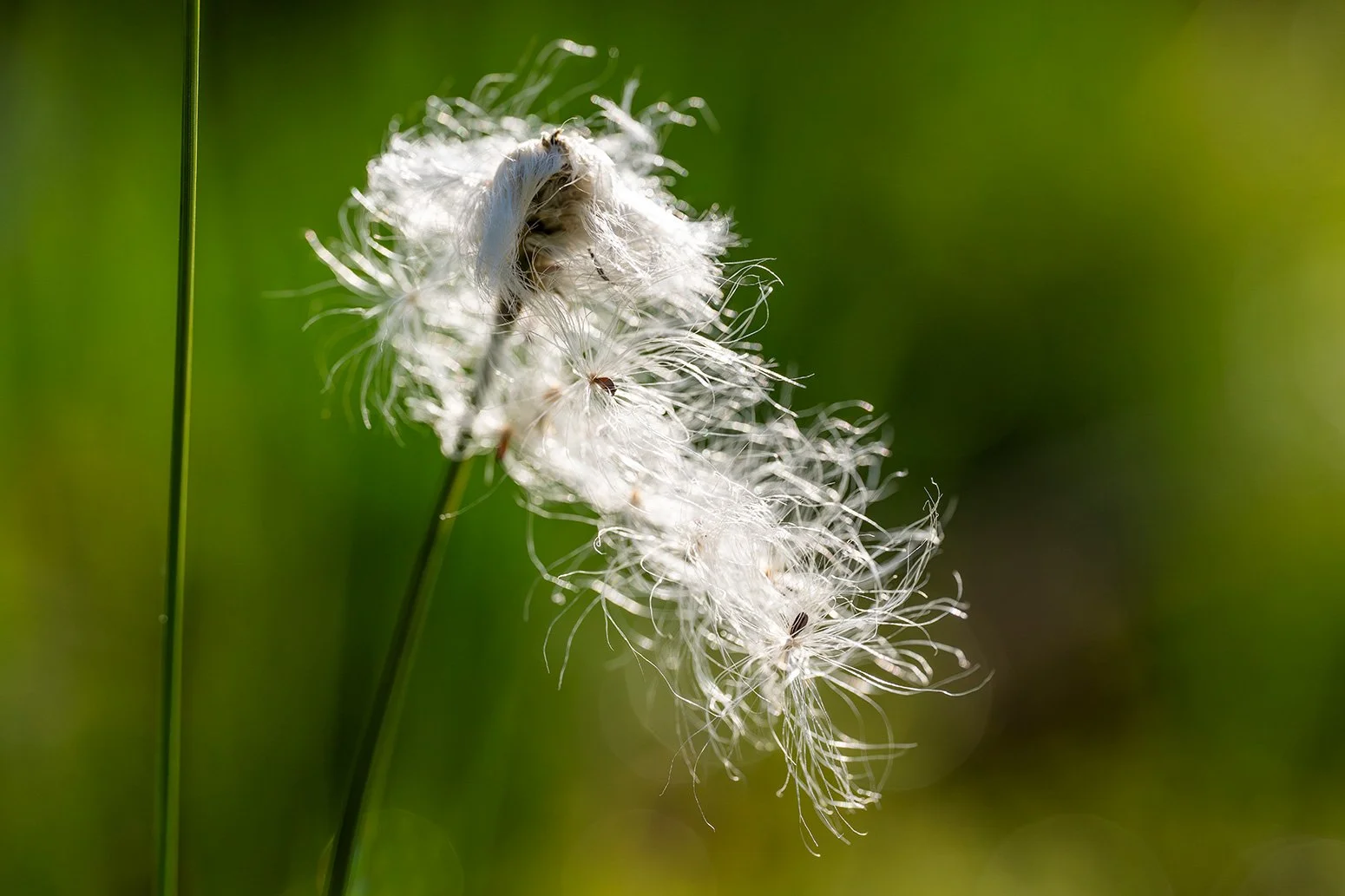 Wie alles in der Natur, habe auch die wolligen Puschel natürlich einen Zweck. Losgelöst vom Stengel, können die Samen mit ihren Windfängern viele Kilometer weit durch die Luft getragen werden und sorgen so für eine Verbreitung der verschiedenen Arten von Wollgräsern.